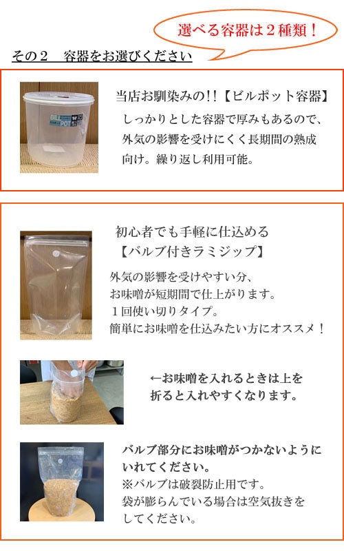 トップ > ●お試しセット/約2キロ出来上がり > 【2回目以降の方はこちら】容器が選べます!お試しセット 手作り味噌2キロ出来上がり(650-330)
